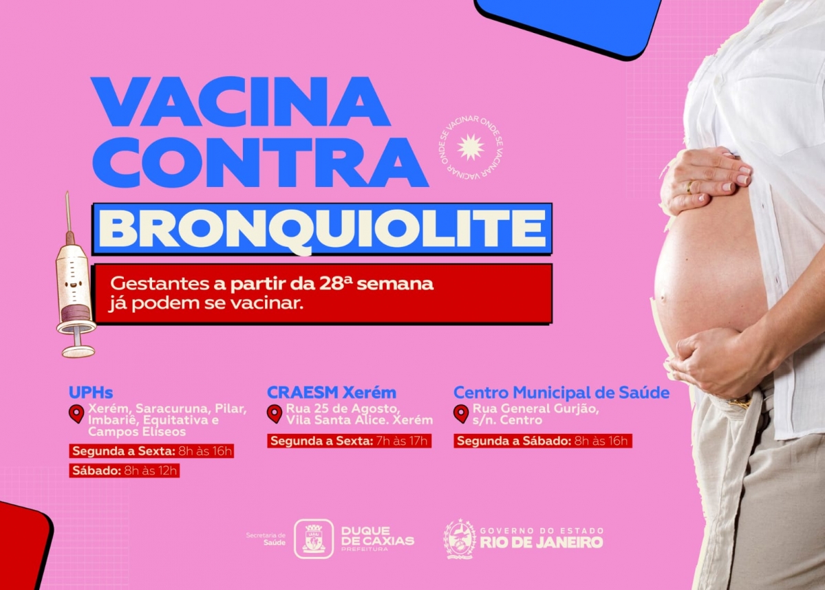 A Prefeitura de Duque de Caxias, por meio da Secretaria Municipal de Saúde, segue com a vacinação para gestantes contra o vírus sincicial respiratório (VSR), principal causa de cerca de 75% dos casos de bronquiolite em crianças menores de 2 anos e de 40% das pneumonias em períodos sazonais. As gestantes poderão ser vacinadas a partir da 28ª semana de gestação, sem restrição de idade materna, para ampliar a proteção de crianças menores de seis meses. O esquema vacinal é com dose única a cada gestação....