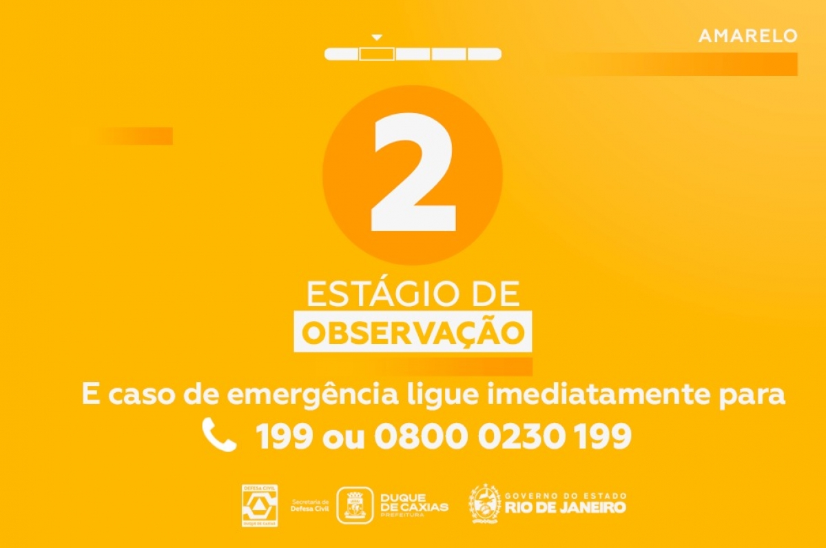 A Prefeitura de Duque de Caxias por meio da Defesa Civil, informa que o município entrou em estágio de Observação, nesta quarta-feira (14/01/2026) às 16h20m, devido ao monitoramento das pancadas de chuvas isoladas, acompanhadas de raios e rajadas de ventos e da continuidade de chuva fraca a localmente moderada para as próximas horas....