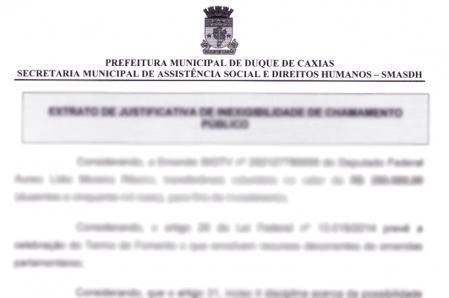 A Prefeitura de Duque de Caxias, através da Secretaria Municipal de Assistência Social e Direitos Humanos, com esteio na Lei no 13.019, de 31 de julho de 2014, Deliberação 277/2017 do Tribunal de Contas do Estado do Rio de Janeiro – TCE-RJ, torna público o presente Extrato de Justificativa de Inexigibilidade de Chamamento Público, oriundo da Emenda Parlamentar. .
