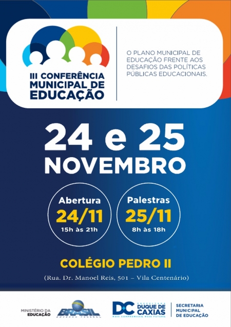 A Prefeitura de Duque de Caxias, através da Secretaria Municipal de Educação, realizará a III Conferência Municipal de Educação nos dias 24 e 25/11, no auditório do Colégio Pedro II – Campus Duque de Caxias. O evento é organizado pelo Conselho Municipal de Educação, em parceria com a SME. O tema desta edição é Plano Municipal de Educação frente aos desafios das políticas públicas educacionais e tem como objetivo analisar, atualizar, discutir e referendar as adequações necessárias no Plano Municipal de Educação (PME), de acordo com as vinte metas do Plano Nacional de Educação (PNE). .