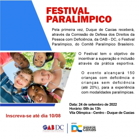 A Ordem dos Advogados do Brasil – 2ª Subseção – Duque de Caxias, através da Comissão dos Direitos da Pessoa com Deficiência (OABDC), em parceria com o Comitê Paralímpico Brasileiro e apoio da Prefeitura de Duque de Caxias, realizarão, pela primeira vez na cidade, um Festival Paralímpico, no dia 24/09, das 7h às 13h, na Vila Olímpica. .